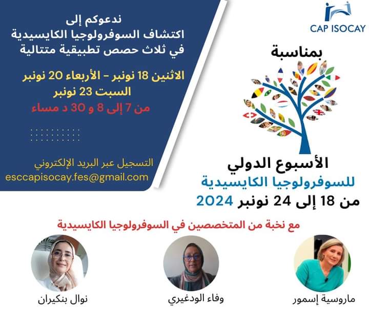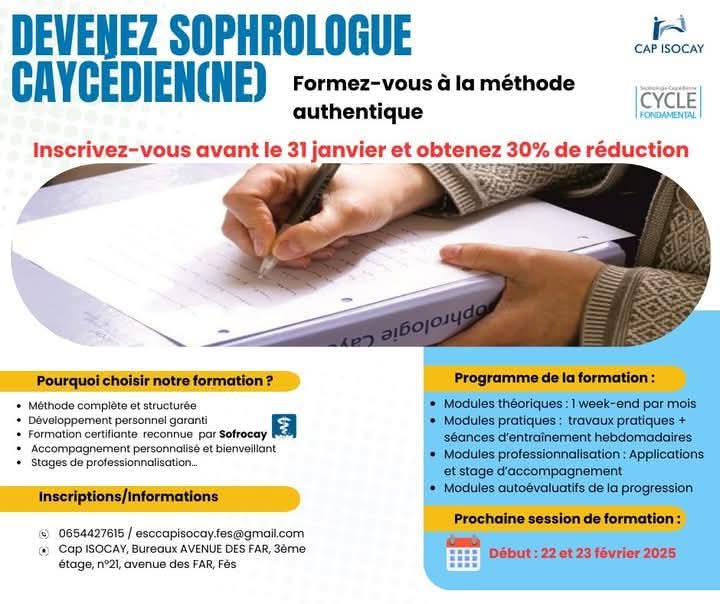 Cap Isocay est la 1ère École de Sophrologie Caycédienne à Fès. L’ objectif de l’École est de former des Sophrologues Caycédiens dans le respect de la Sophrologie telle que l’a créée le Pr. A. Caycedo.